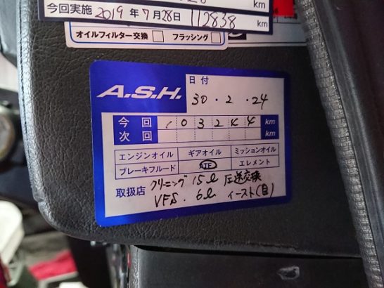 走行距離 103244キロ時に トータル21L 交換暦ステッカー 有り