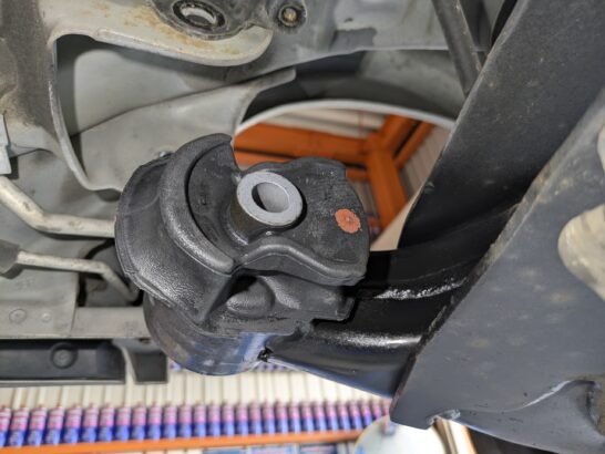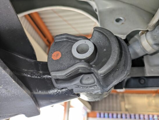 新品ブッシュを圧入したアクスルビームを車体に装着・・・