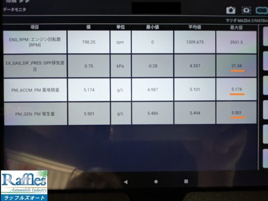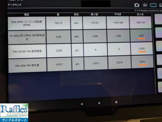 DPF排気差圧 4.63kPa 始めより 16.71kPa 改善