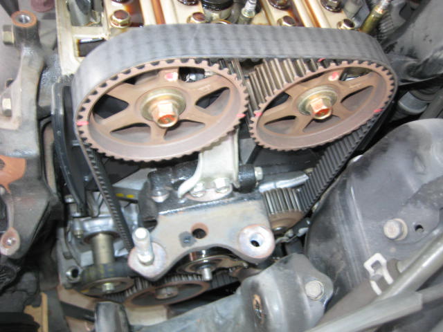 タイミングベルト・テンショナー・オートテンショナー・ウォーターポンプと取り外した状態です。