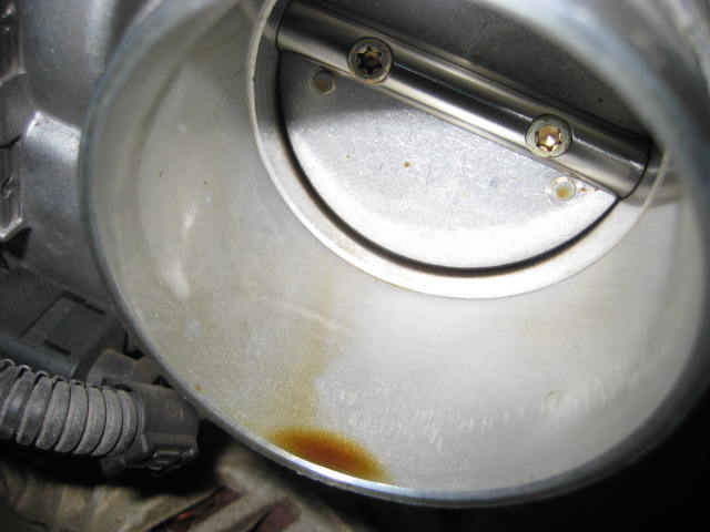 洗浄前のスロットルですが、バルブ周りオイル分たっぷりギットリ汚れてますね~。